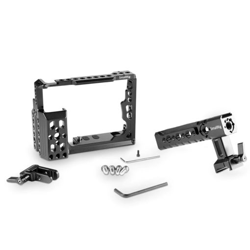 SmallRig Basic Cage Kit 2022 is equipped with NATO Handle 1955 on the top, which is more comfortable and suitable for you in low height shooting. The NATO Handle equipped with one cold shoe could attach microphone directly or could attach magic arm and then monitor. It works withHDMI Lock 1679 to lock HDMI cable and prevents it from loosening. The cold shoe on the top of cage could attach microphone directly. The camera is locked tight on the cage via the screws on the bottom and the right side. It comes with an array of 1/4’’ threaded holes on the top, which could attach magic arms of double-threaded screw and then monitor. The Arca quick release plate on the bottom could attach Arca Swiss Dovetail Clamp 1711 or sit on tripod of Arca standard. The NATO rail on the right side could connect QR Cheese Handle 1688. The threaded holes on the bottom is compatible with Arca/Manfrotto quick release plates for relevant baseplate or tripod.